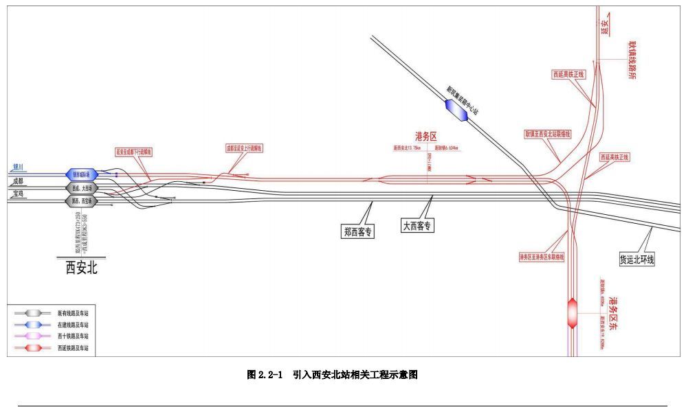 未来西延线将引入西安北站,届时将于西延高铁耿镇线路所引出,南行折向西跨越西禹高速、货北环线接入港务区站,出站后继续向西跨越灞河引入西安北站东端与银西高速正线贯通。