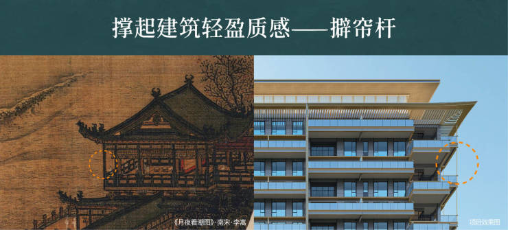 以宋代生活为模板,通过云顶飞檐、版引檐、擗帘杆、挂䈋、寻杖、平坐等中式建筑元素的现代演绎,实现功能与美学的平衡。