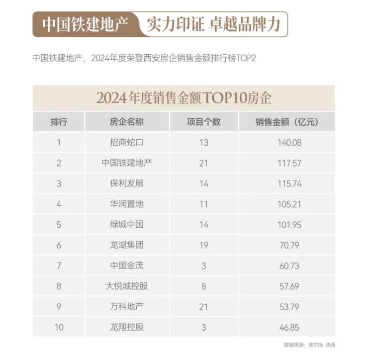 2021年以来,在百强房企销售规模腰斩情况下,中国铁建地产实现了逆势增长,规模保持千亿,排名连创新高,3年前进31名。以中国铁建地产为龙头的中国铁建房地产板块,2023年全口径销售额1216亿元,排名第15;2024年上半年全口径销售额395亿元,排名第13,其中权益销售排名第10,2024 年度荣登西安房企销售金额排行榜 。