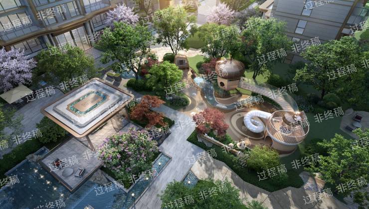 打造约1380㎡灵动水境,从“曲江流饮”中汲取灵感,以叠水、静池、瀑布等多种形态,再现盛唐曲江池的开放与灵趣,重塑当代社区的亲水生活范本。