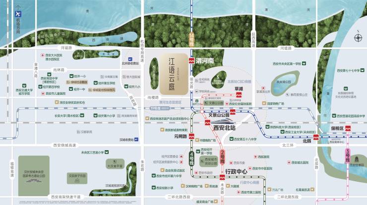 轨交丨绿城•江语云庭占位西安经开区高铁新城,毗邻城北两大商圈:北客站、行政中心商圈,徐徐铺开美好生活的丰盈蓝图。