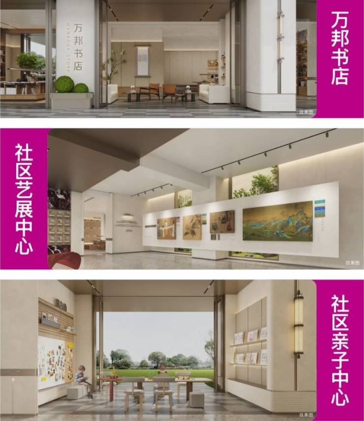 考虑到居住全龄体验以及居住社交需求,「语澜溪」也将泛会所功能空间进行特别定制化,打造社区艺展中心、社区亲子中心,以及特意引入万邦书店,将轻奢生活与艺术人文、全龄互动、亲子享乐全维度覆盖,打造社交互动的“艺术会客厅”,为各年龄层次及爱好不同的业主生活注入更多的欢乐与关怀。