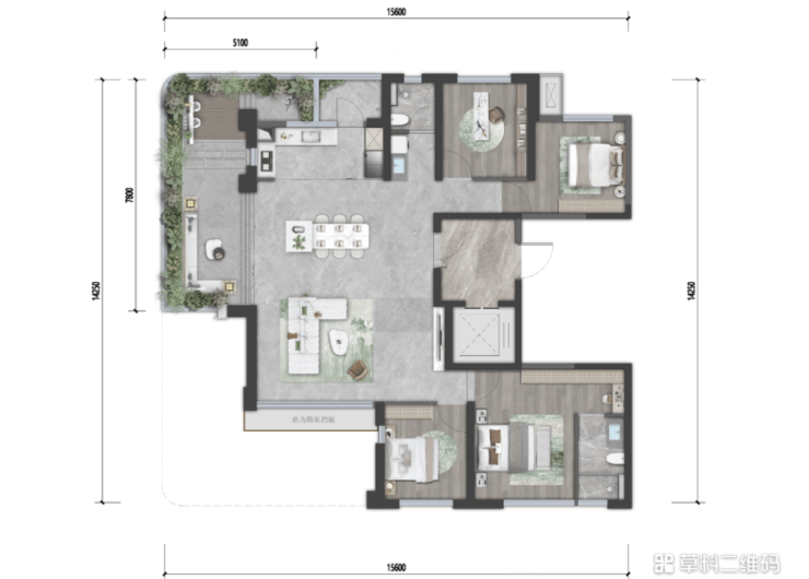 功能型四房设计,约30-32㎡观景露台,约5㎡私享入户前厅,约23㎡酒店式套房主卧,约126%实享空间,尽揽蔚然风景