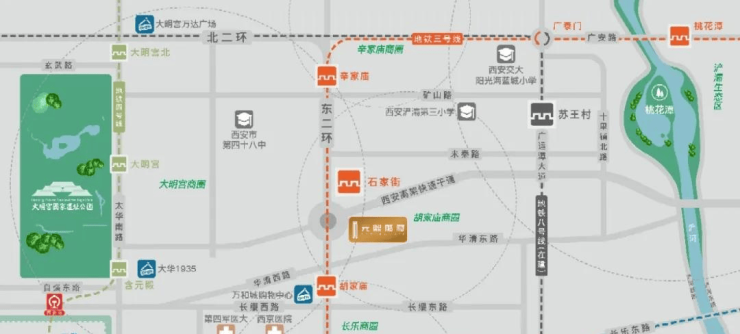 项目位于西安东二环黄金腰带位置,(地铁3号线石家街站),东接浐灞新区,南邻轻工商贸中心,西近大明宫遗址,北接繁华的未央区,处于金花路商圈的核芯居住区,也是浐灞生态区的门户位置。