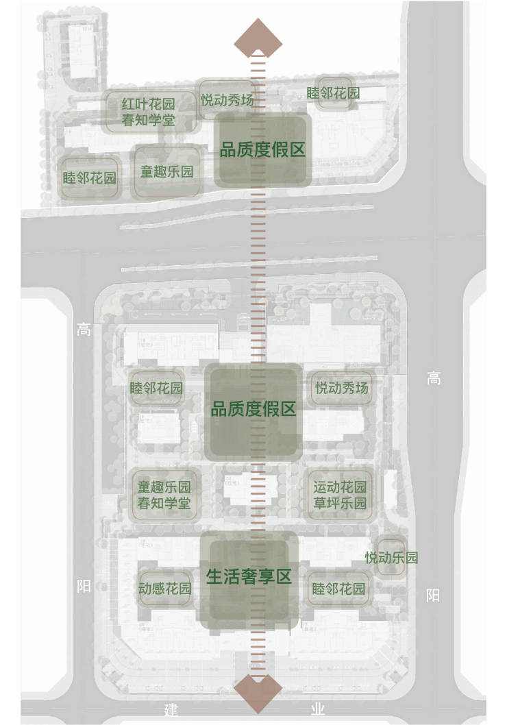 三境:北区-品质度假区,南区-品质度假区、生活奢享区,多花园-童趣乐园、悦动秀场、红叶花园、春知学堂