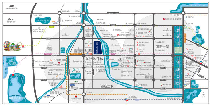 商业:项目沿科技西路向东约2公里,是即将开业的全新城市地标——大茂城,一个集购物、体闲娱乐、体验生活为一体的15万㎡大型商业综合体。同时依托3号线,可快速到达高新一期、小寨、曲江等核心商圈,繁华咫尺。