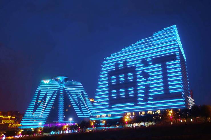 将盛唐建筑的恢宏形制与时尚的先锋主义融合重构。蓝棕石材与落地窗,交织出虚实相生的光影韵律。屋顶提取唐代建筑“官帽”形制,以平缓出挑的飞檐,勾勒出独特的天际线。细节处,以流线型鎏金铝板曲面锻造,再现盛唐的华贵气度与精湛工艺。
