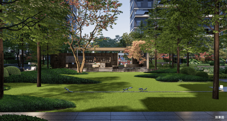 园林规划传承古长安外市内坊格局,融合热闹街区和酒店化空间,打造 “二轴四园” 布局,以“天地四季” 主题花园庭院为精华所在,归家如同微度假,四季皆有不同观感体验。