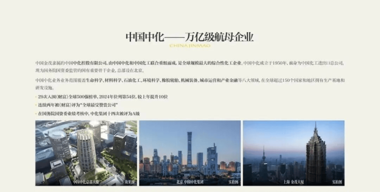 • 中国中化集团是中国金茂的母公司,成立于1950年 ,国资委监管的国有骨干企业,“中国四大国家石油公司”之一,全球最大综合性化工企业之一。