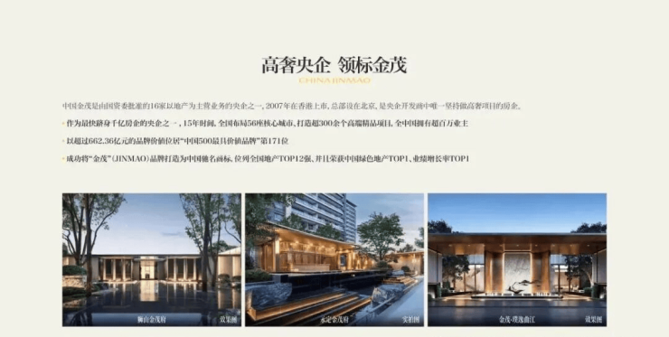 中国金茂是由国资委批准的16家以地产为主营业务的央企之一,2007年在香港上市,总部设在北京,是央企开发商中唯一坚持做高咨项目的房企。作为最快跻身千亿厉企的央企之“,15年时间,全国布局56座核心城市、打造超300余个高端销品项日,全中同拥有超百万业主以超过662.36亿元的品牌价销位居“中国500最具价销品牌”第171位