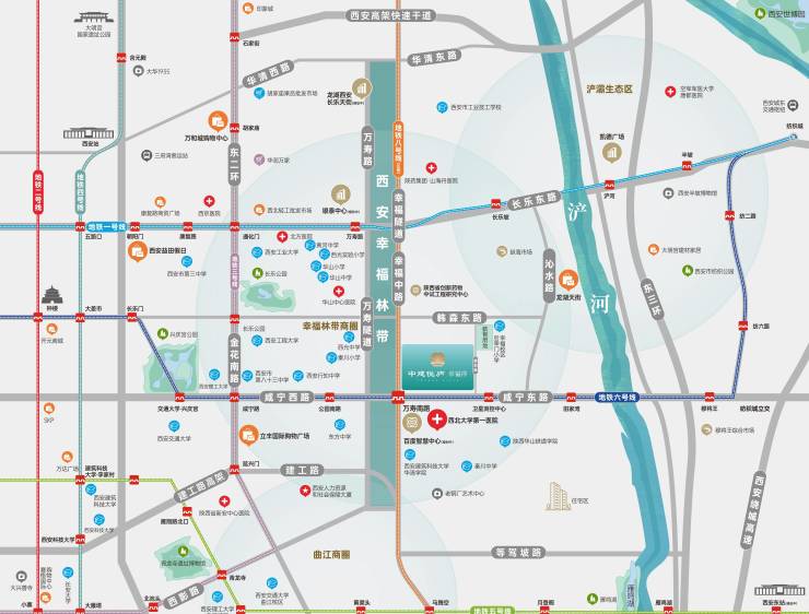 无缝接驳地铁6号线、8号线在中),其中8号线为西安唯一的地铁环线,串联5大主城区。同时项目直连二环及三环,可快速通达全城。